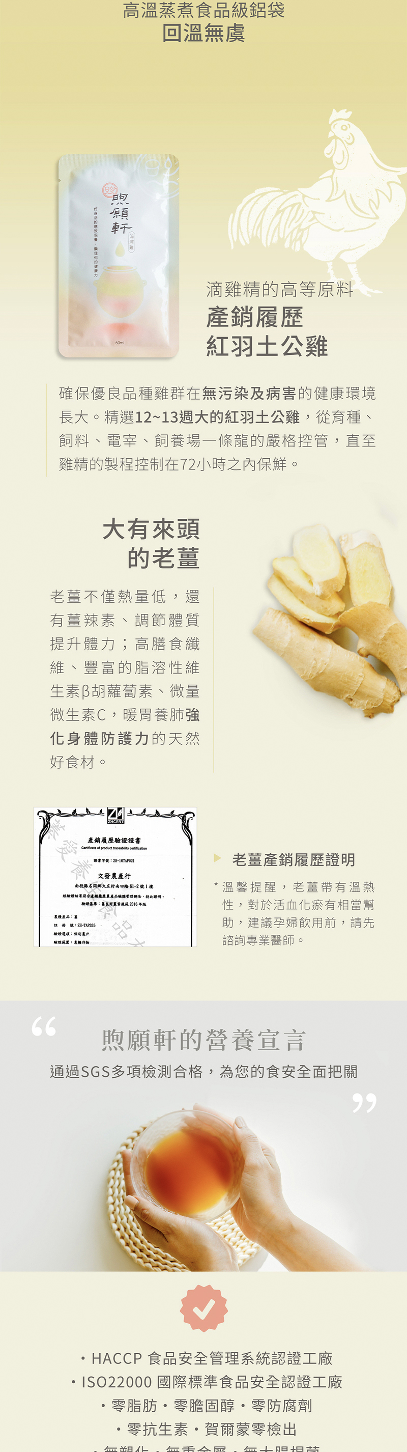 搭配全台第一創立古法陶甕蒸煉,全程無添加一滴水,零脂肪、膽固醇、防腐劑、抗生素、賀爾蒙,富含優質蛋白質(8.4g/100ml)、總支鏈胺基酸(620mg/100g)讓雞精與老薑交融出清香鮮甜的暖身溫補聖品